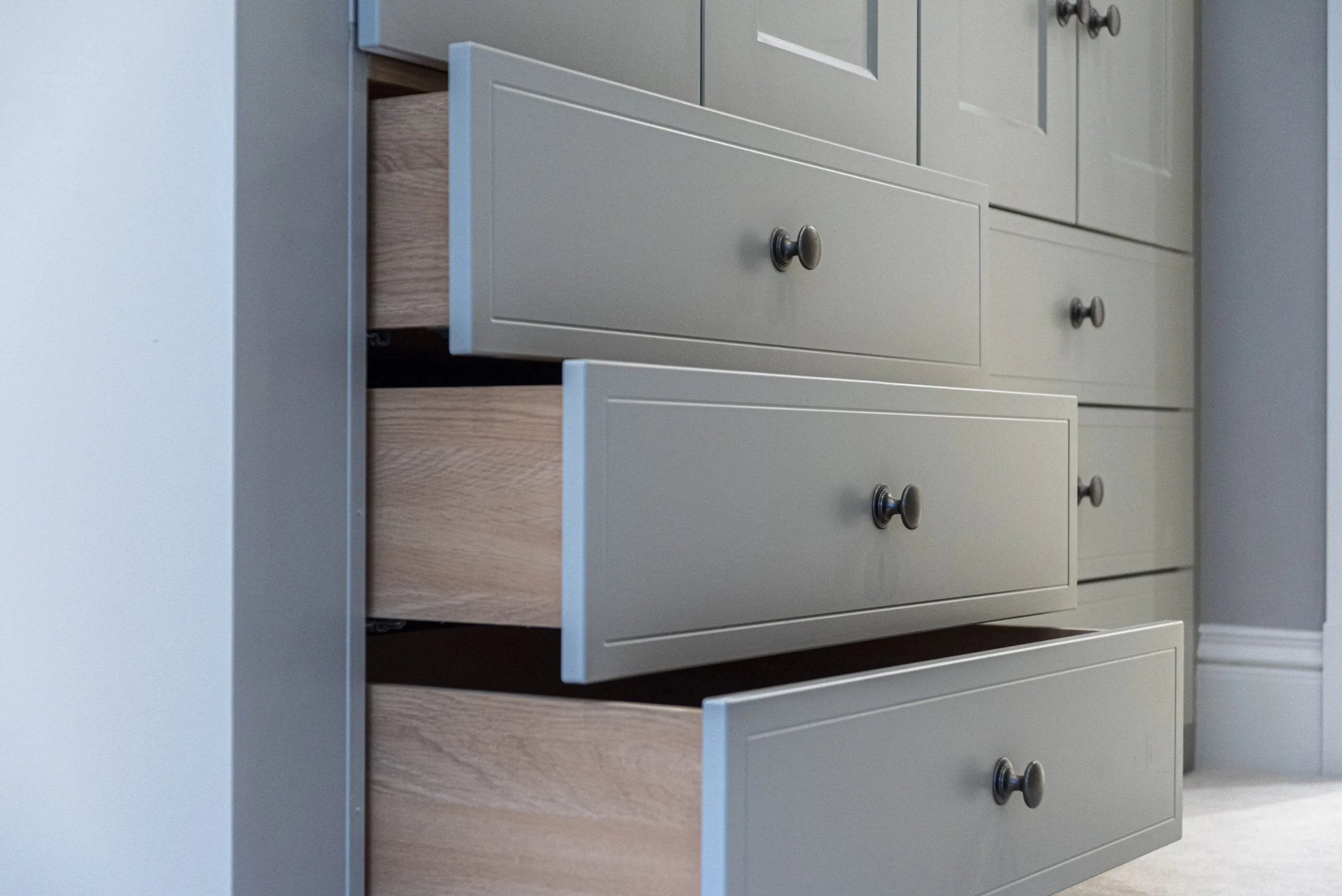 As every single piece we make is unique to you, we don’t have an extensive price list that confusingly outlines standard costs. Instead, we make the process easier by offering simple, honest quotes to our clients with no hidden costs. Typically, our fitted bedrooms, walk-in wardrobes, and home offices start from £1,000 but vary depending on the design and finishes you choose, as well as the size of your space.